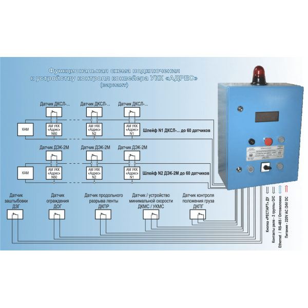 Устройство контроля конвейера УКК «Адрес» - обеспечивает сбор информации от первичных датчиков и устройств, контролирующих основные характеристики конвейерного транспорта, работоспособность и исправность его отдельных частей, узлов и механизмов. При возникновении аварийных ситуаций Устройство УКК «Адрес» отключает и блокирует электропривод.