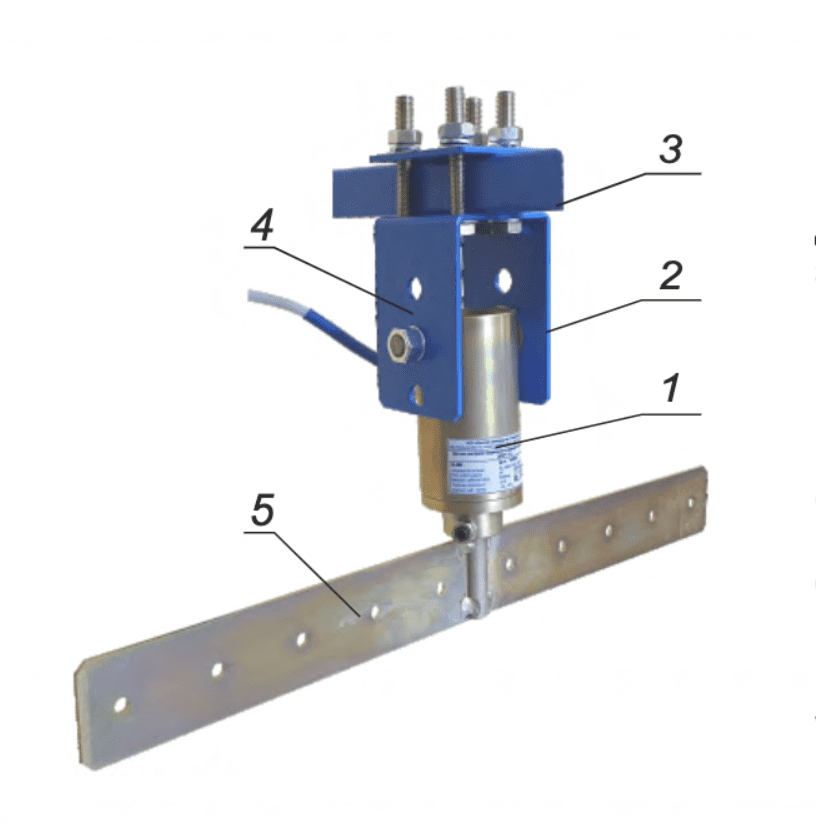 Датчик ДКПР1(2)-... устанавливается над холостой ветвью, вблизи перегрузочной течки и крепится кронштейном (2) к ставу конвейера (3) с помощью «Пластины крепления» из комплекта поставки . В кронштейне имеются отверстия (4) для регулировки датчика по высоте. В нижней части датчика закреплен удлинитель с поперечной планкой (5). Рабочее положение датчика вертикальное.