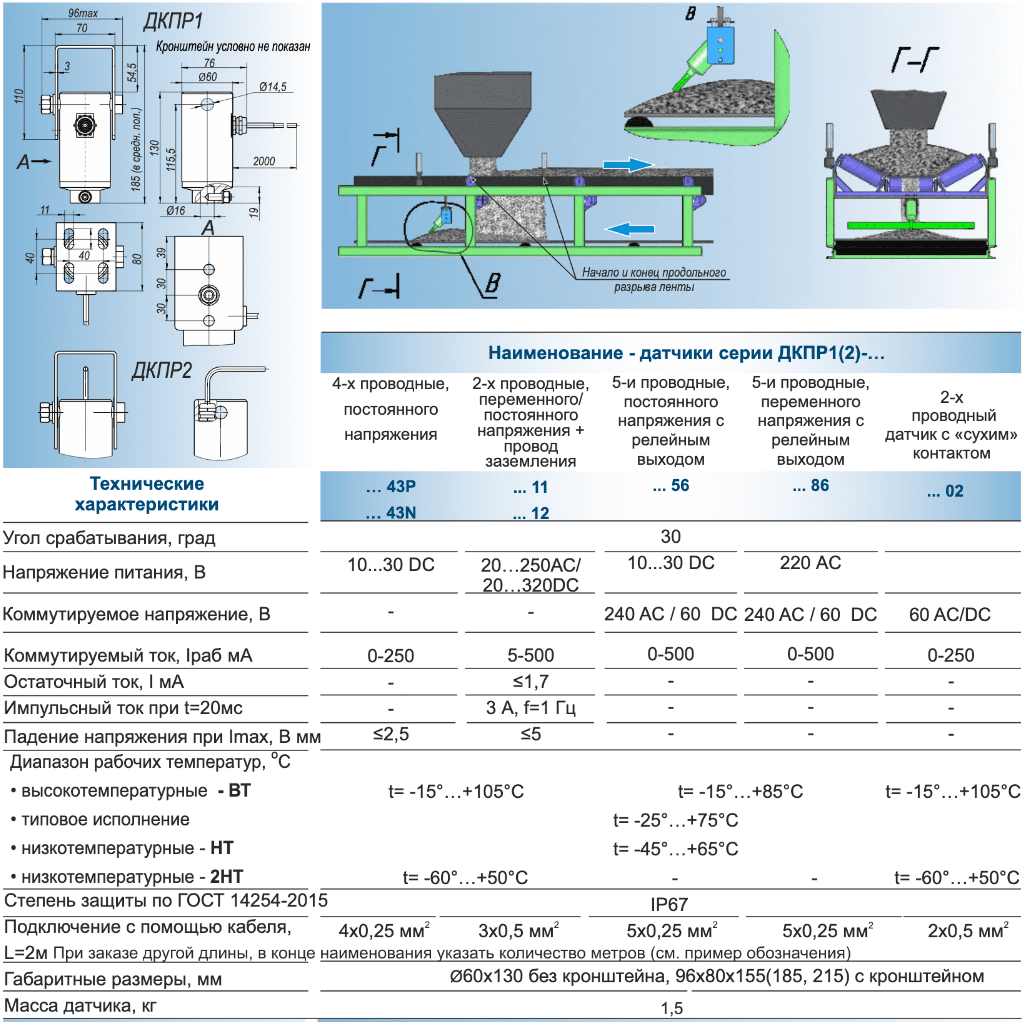 Датчики серии ДКПР1(2)-... предназначены для контроля продольного разрыва конвейерной ленты на конвейерах с прямой и V-образной холостой ветвью. В основе изделия датчик предельного угла наклона (патенты ФИПСNo109551 и No110473 от 20.11.2011г.)