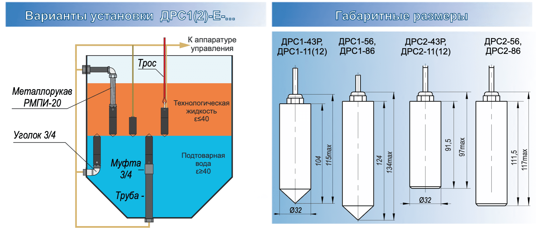 Датчики раздела сред емкостные серии ДРС1(2)-Е-... - предназначены для контроля уровня водосодержащих жидкостей с относительной диэлектрической проницаемостью ε ≈ 80 (вода, водные растворы, сточные воды и др.) в металлических и неметаллических резервуарах содержащих многофазные жидкости (масло - эмульсии - пена - подтоварная вода и т.д.). При производстве датчики серии ДРС-Е-... настраиваются на материалы с коэффициентом относительной диэлектрической проницаемости ε ≈ 40 и выше, это делает датчик нечувствительным к материалам с более низким коэффициентом.
