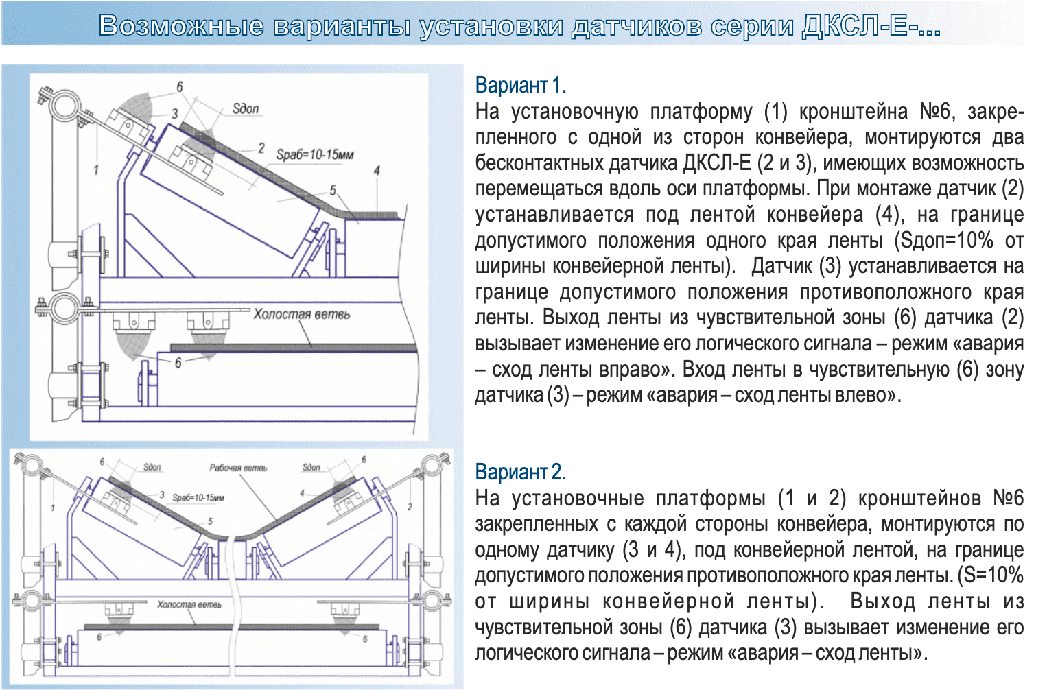 Датчики контроля схода ленты емкостные серии ДКСЛ-Е-... предназначены для контроля аварийного схода рабочей и холостой ветви конвейеров в сторону и выдачи сигнала (путем замыкания или размыкания электрической цепи) в систему дистанционного или автоматического управления, на всех типах ленточных конвейеров.