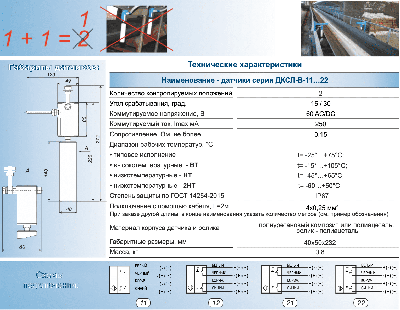 Датчики контроля схода ленты серий ДКСЛ-В-11...22 имеют две пары контактов, изменяющих свое состояние в зависимости от угла срабатывания – при наклоне от вертикали на 15 и 30 градусов соответственно и позволяют контролировать положения конвейерной ленты в трех зонах:- при наклоне корпуса ДКСЛ-В-... до 15º - режим «РАБОТА», при этом электрические контакты датчика находятся в исходном состоянии.- при наклоне от 15º до 30º - режим «ТРЕВОГА», переключается первая пара контактов.- при наклоне от 30º и выше – режим «АВАРИЯ», переключается вторая пара контактов.Датчики соответствуют ГОСТ 24754-2013 «Электрооборудование рудничное нормальное РН» и должны применяться на конвейерах, работающих в различных отраслях промышленности, в подземных выработках рудников и шахт, не опасных в отношении взрыва газа и угольной пыли