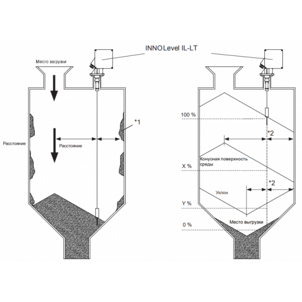 INNOLevel IL-LT устанавливается на крышке емкости. Чувствительный груз закреплен на конце ленты, которая намотана на катушку с электромеханическим приводом. Груз опускается в емкость, касается поверхности хранимого материала,направление вращения катушки меняется на противоположное и груз возвращается в свое исходное верхнее крайнее положение. Во время движения чувствительного груза вниз пройденное расстояние измеряется электронно при вращении катушки с лентой. Микропроцессор переводит измеренную дистанцию в выходной сигнал, который учитывает особенности объема и геометрии силосной конструкции. Выходной сигнал обновляется после касания чувствительного груза измеряемого материала.