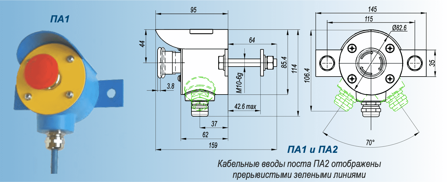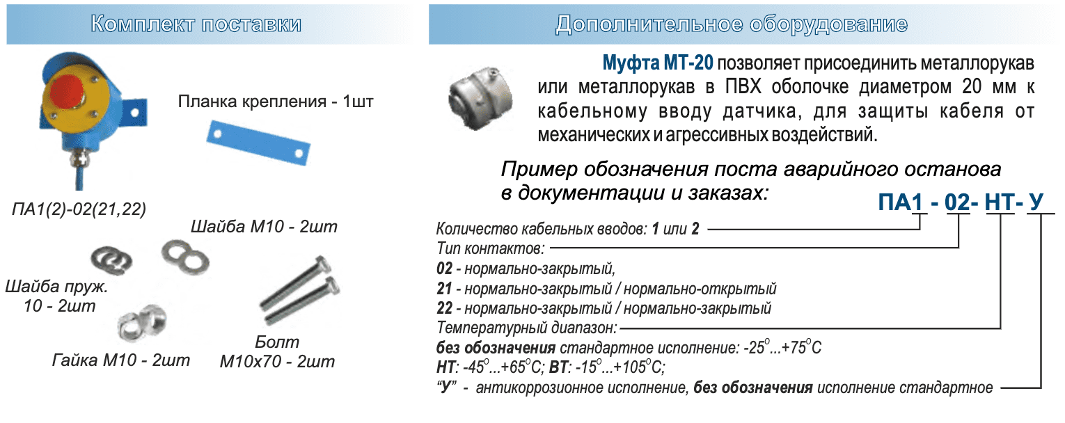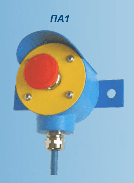 Пост аварийного останова - ПА1(2)-...- обеспечивает отключение силовых цепей в аварийных случаях путем размыкания или замыкания электрической цепи в схемах дистанционного или автоматического управления.Пост аварийного останова может быть использован для отключения конвейеров, перегружателей, дробилок, подъемников, станков, насосов, вентиляционного оборудования и других агрегатов с электрическим приводом.