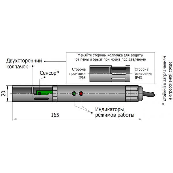 • Система индикация датчика сообщает о самодиагностике и режимах работы.