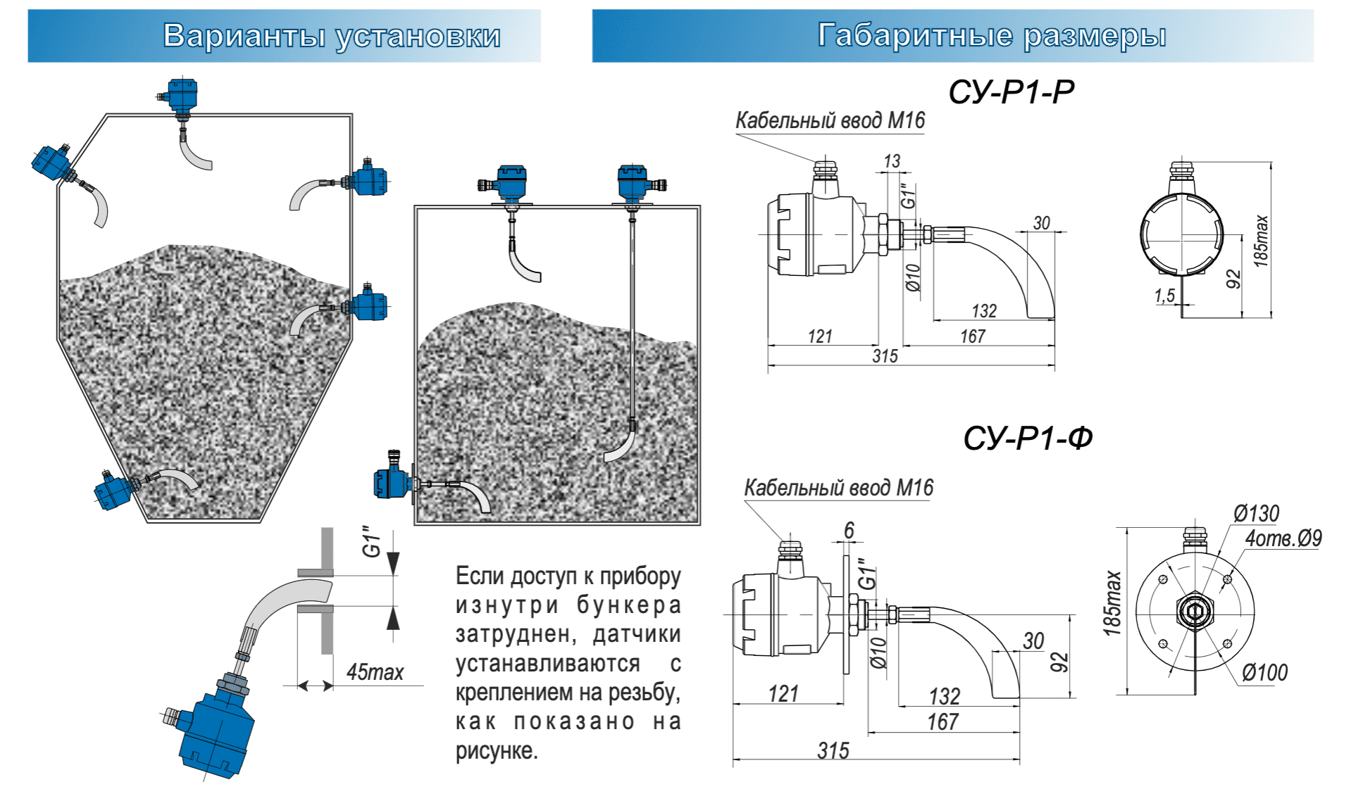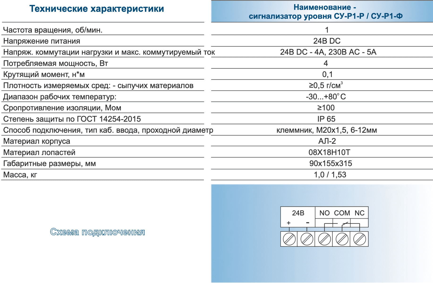 В основе сигнализатора СУ-Р1 - электродвигатель с механическим, тихоходным редуктором. Через обгонную муфту редуктор соединяется с валом сигнализатора, на котором крепиться насадка из комплекта поставки. Во время отсутствии материала в зоне контроля, вал беспрепятственно совершает круговое движение. При появлении материала в контролируемой зоне, лопасть насадки встречает сопротивление, что вызывает снижение скорости вращения и перемещение обгонной муфты. Муфта, в свою очередь, воздействует на механический микропереклю-чатель, изменяя состояние его контактов.