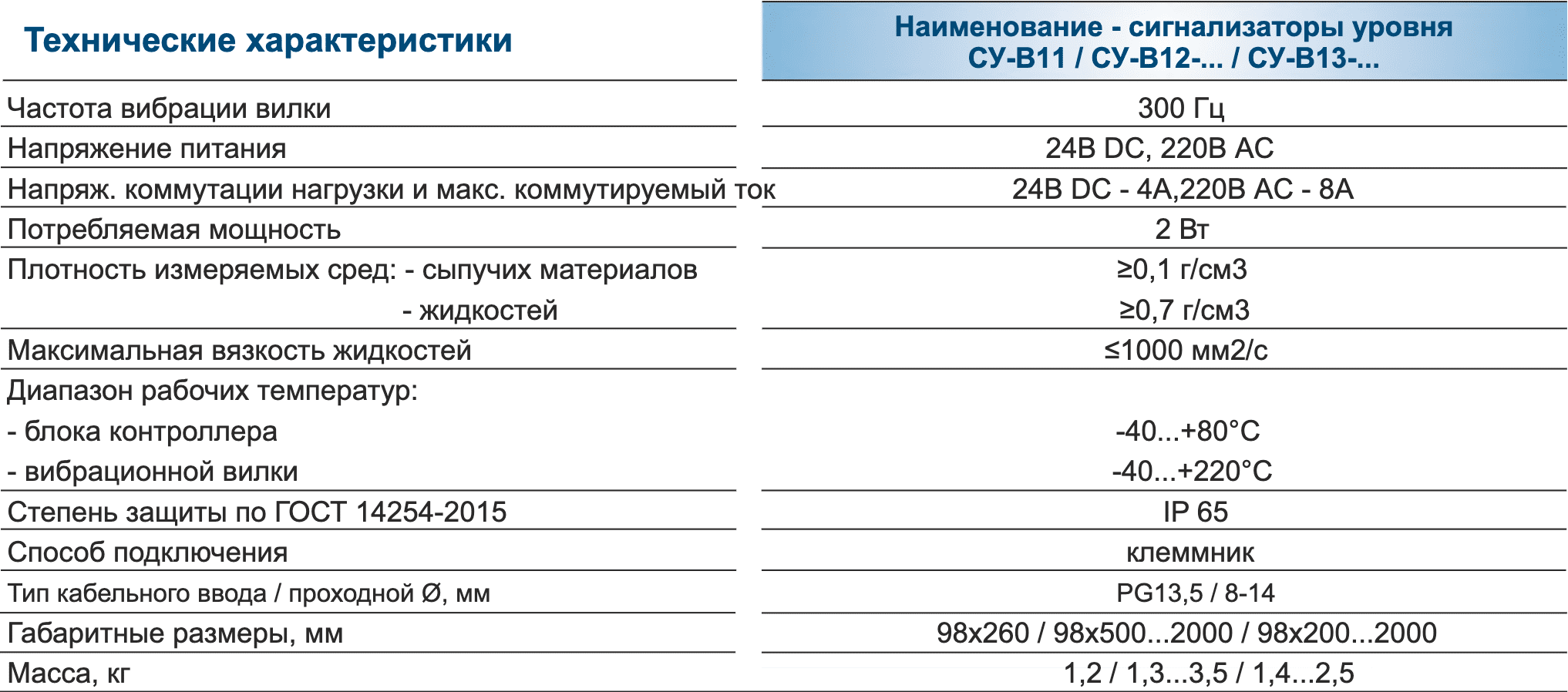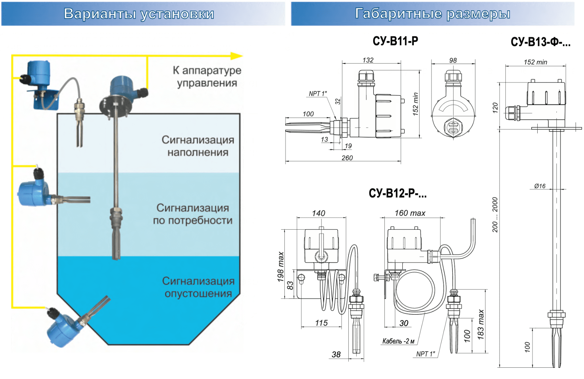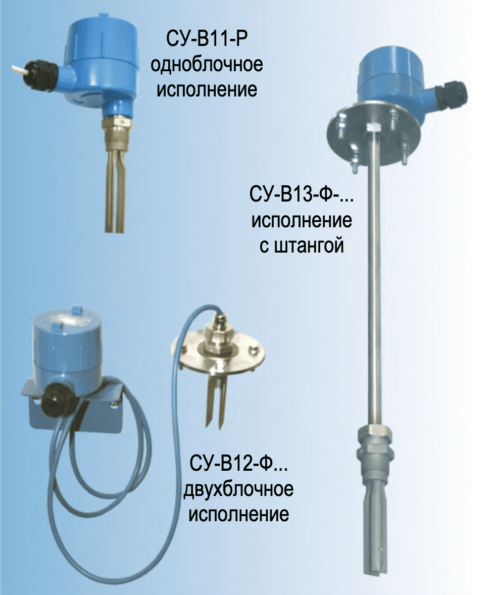 Сигнализатор имеет три варианта исполнения - одноблочное, двухблочное и с штангой-удлинителем, что значительно расширяет область его применения. У сигнализатора в двухблочном исполнении СУ-В12-... блок контроллера соединен с вибрационной вилкой кабелем, длиной от 0,5 до 2 м, по желанию заказчика. Сигнализатор СУ-В13-... имеет штангу-удлинитель из нержавеющей стали с общей длиной чувствительной части от 0,2 до 2 м.