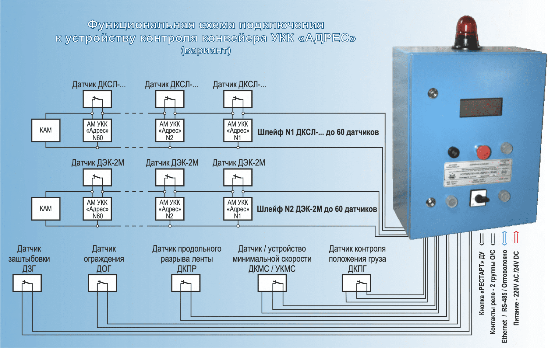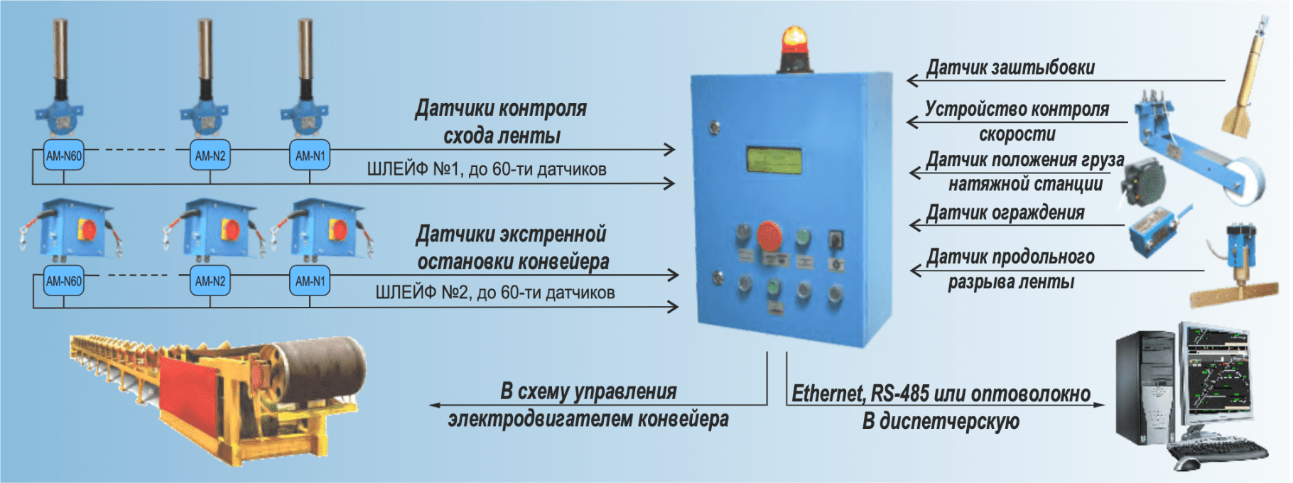 Устройства контроля конвейера УКК «Адрес» и УКК «Адрес»-RS485 - предназначены для сигнализации, отключения и блокировки электропривода в случае возникновения аварийной ситуации при получении сигнала от датчиков, обеспечивающих безаварийную работу конвейерного транспорта.ё