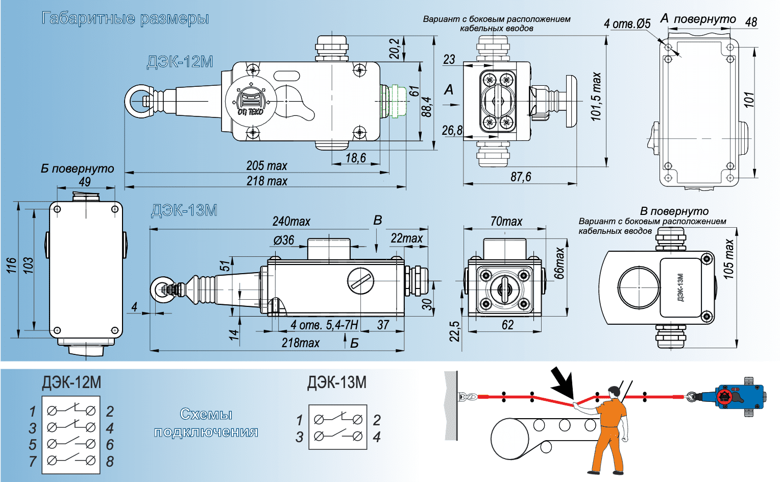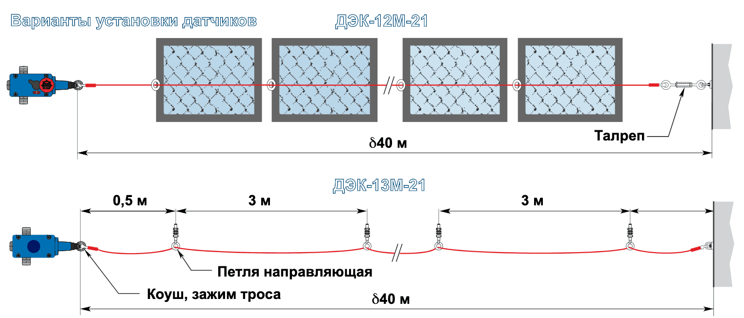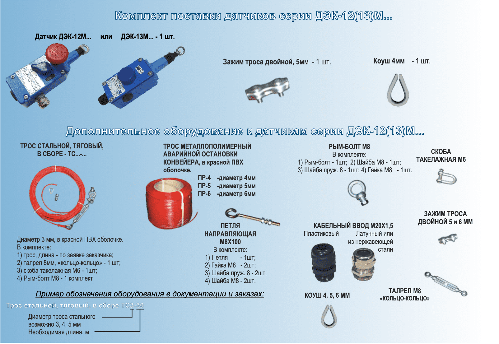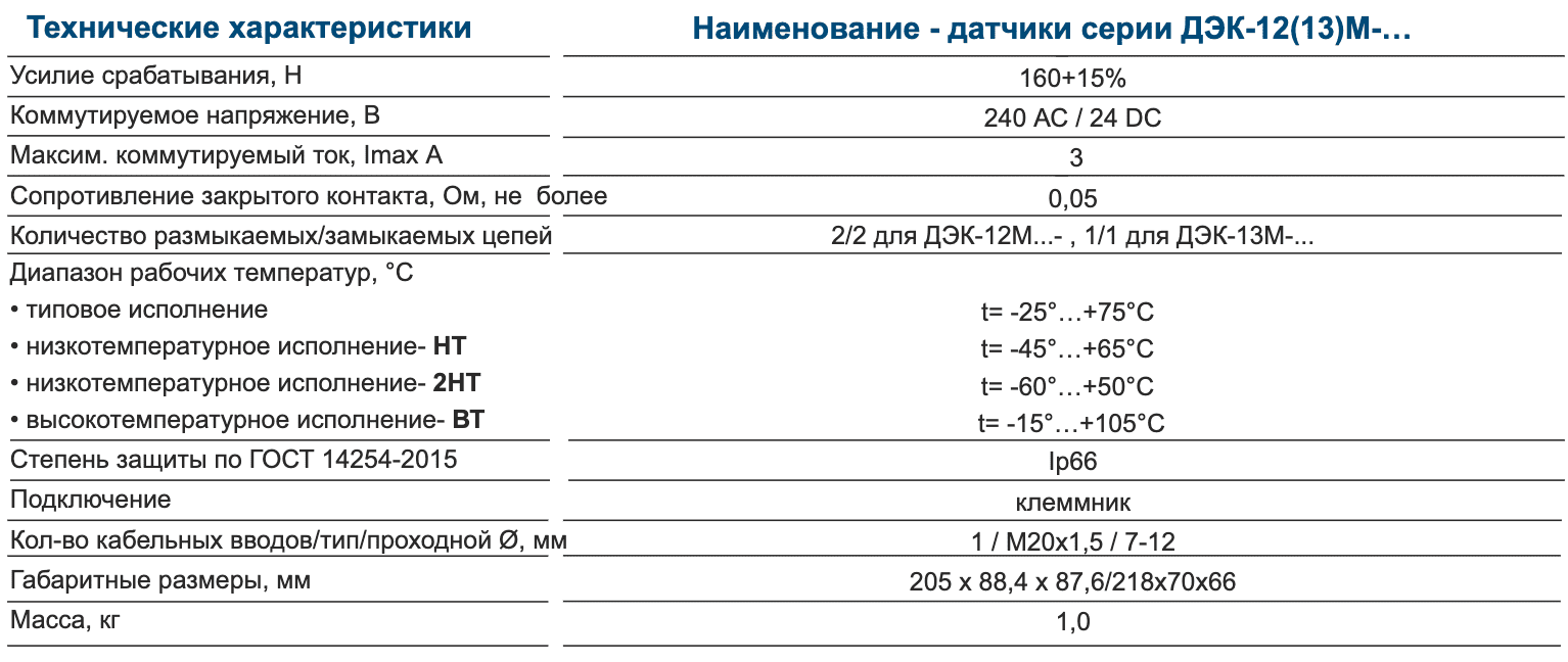 Датчики серии ДЭК-12М-... универсальны в своем применении и способны одновременно обеспечить экстренную остановку конвейера в случаях:- натяжения троса при возникновении аварийной ситуации;- обрыва троса при несанкционном вскрытии ограждения конвейера.Датчики ДЭК-13М-... обеспечивают экстренную остановку конвейера в случае натяжения троса.Датчики обеспечивают фиксацию отключенного положения.Датчики ДЭК-2(3)М-... "пассивные" (для работы не требуют питания) и имеют «сухой контакт».