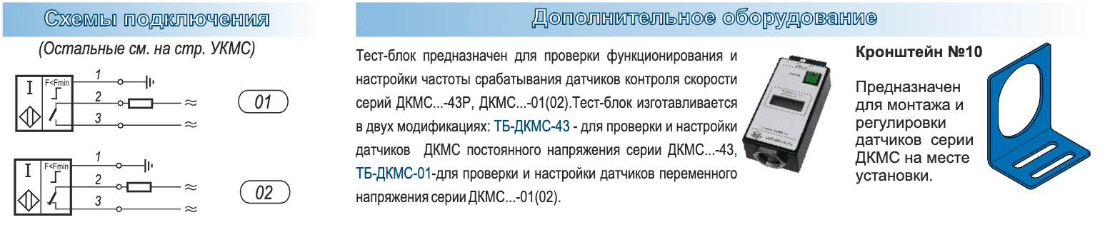 Датчик ДКМС имеет встроенную схему контроля частоты воздействия, которая управляет выходным коммутационным элементом. При вращении барабана металлические части (спицы барабана, зубья шестерни, приливы и т.д.) воздействуют на чувствительную поверхность датчика с частотой пропорциональной частоте вращения. Схема контроля частоты сравнивает частоту воздействия с заданной пороговой. Снижение частоты воздействия ниже пороговой вызывает изменение логического сигнала датчика. Заказчик имеет возможность настройки на требуемую пороговую частоту на месте эксплуатации с помощью встроенного потенциометра. Для самостоятельного сервисного обслуживания, проверки функционирования и настройки частоты срабатывания датчиков контроля минимальной скорости, рекомендуется использовать тест-блок.