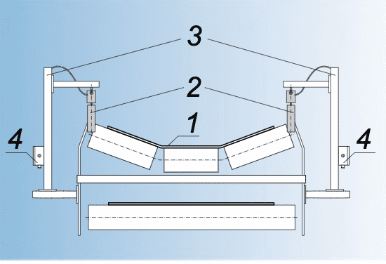 На кронштейны (3) закрепленные с каждой стороны конвейера, вертикально, монтируются по одному датчику (2), на границе допустимого положения края ленты (S=10% от ширины конвейерной ленты) и клеммные коробки (4). Выход ленты (1) из допустимой зоны приводит к наклону датчика. Отклонение датчика от вертикальной оси свыше заданного угла ( 30º) вызывает изменение его логического сигнала – режим «авария».