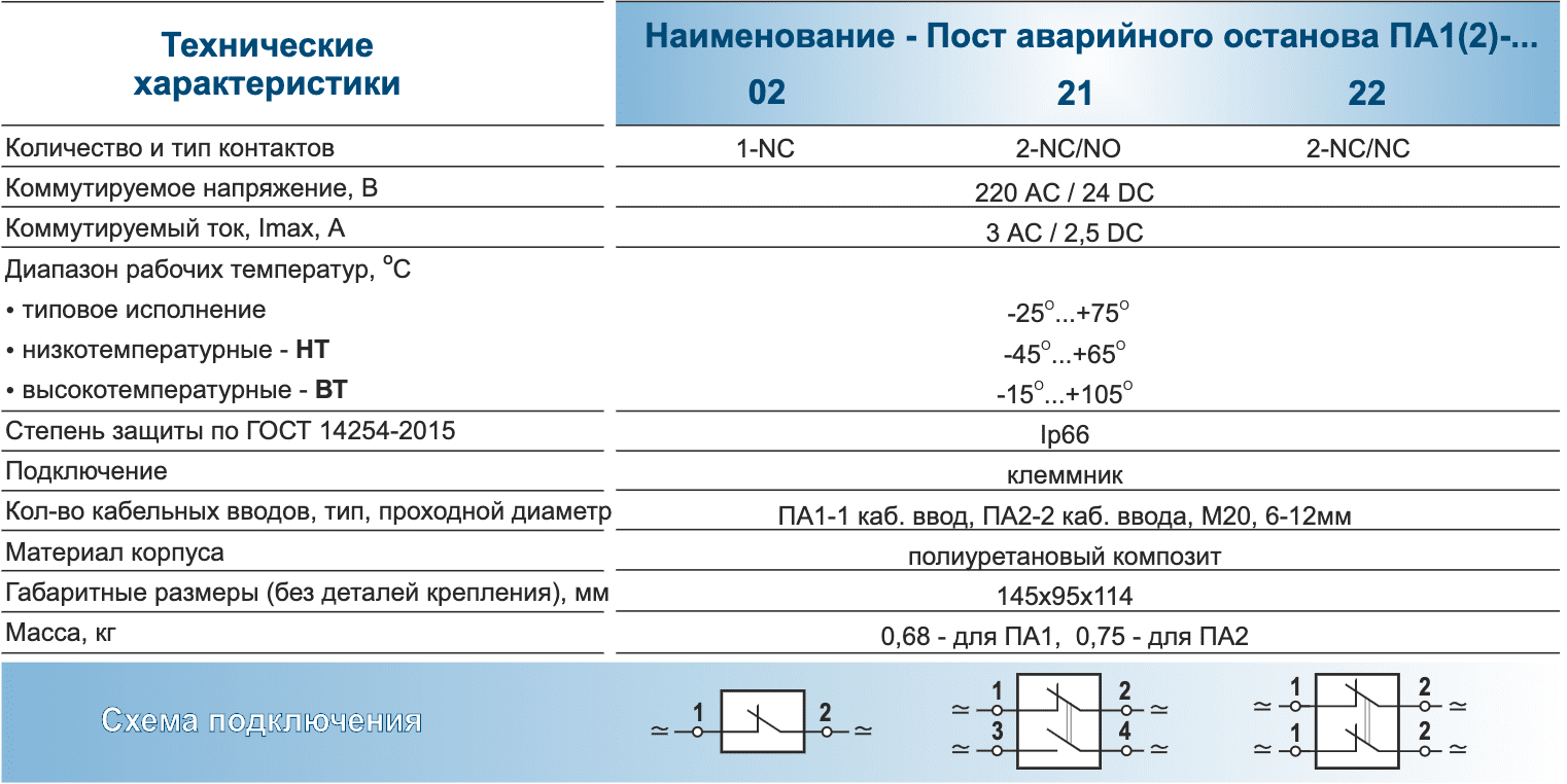 Пост аварийного останова - ПА1(2)-...- обеспечивает отключение силовых цепей в аварийных случаях путем размыкания или замыкания электрической цепи в схемах дистанционного или автоматического управления.Пост аварийного останова может быть использован для отключения конвейеров, перегружателей, дробилок, подъемников, станков, насосов, вентиляционного оборудования и других агрегатов с электрическим приводом.
