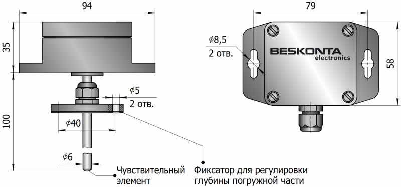 • Чувствительный элемент покрыт антикоррозионным слоем и защищён слоем компаунда и прочным металлическим корпусом.