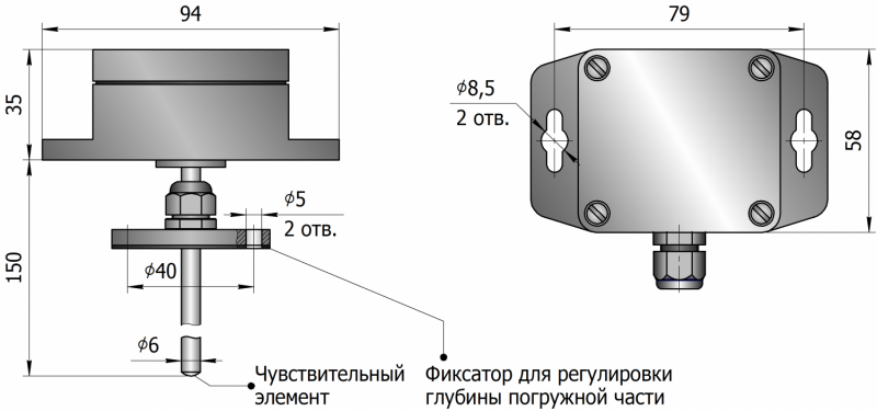 • Чувствительный элемент покрыт антикоррозионным слоем и защищён слоем компаунда и прочным металлическим корпусом.