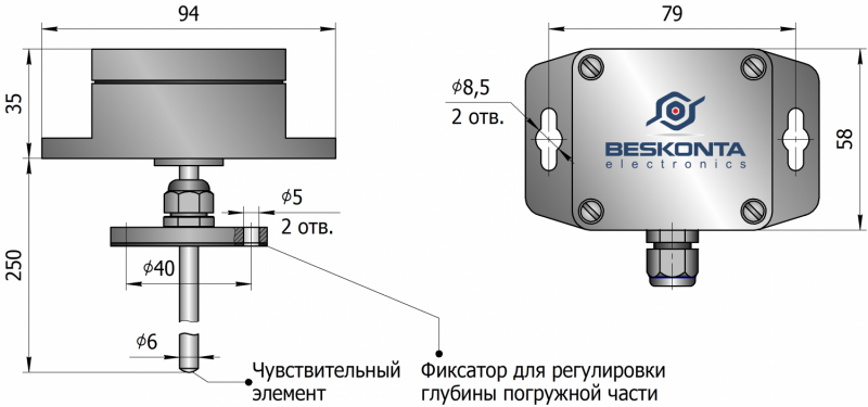 • Чувствительный элемент покрыт антикоррозионным слоем и защищён слоем компаунда и прочным металлическим корпусом.